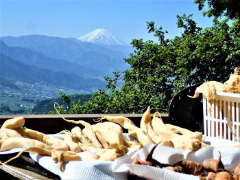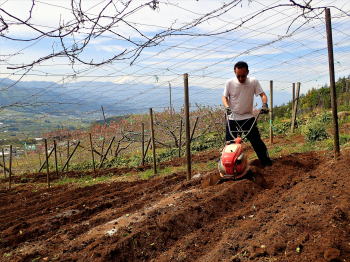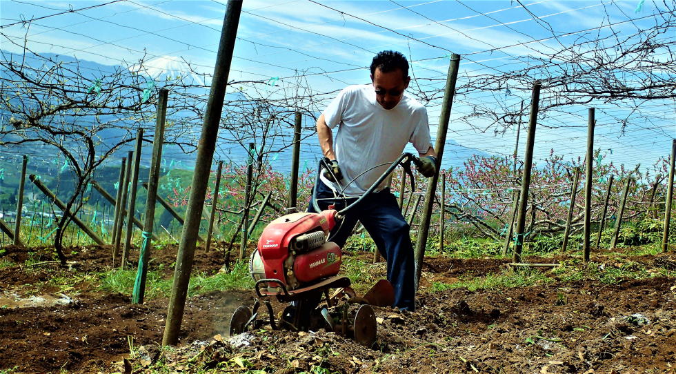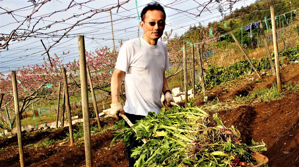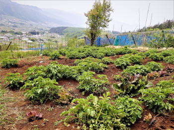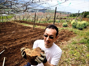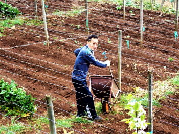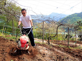 | 雪富士を眺めながら百姓に変身! 5月4日(木)晴 微かに残る桃の花を背に 最初ヤッケを着て一輪車でほうれん草を運んでいた陽介も、Tシャツ1枚になって肉体労働に励む。 残滓を立鍬で取り除き施肥し、耕運機掛け。これも陽介にやらせる。 山荘に来るたびに耕運機を操作させているので、使い勝手は解ってはいるが 山の傾斜畑で言うことをきかぬ耕運機に悪戦苦闘する陽介。耕耘の仕上げは立ち鍬を使って畝作り。 |
