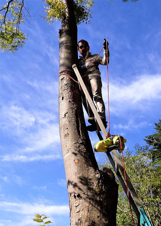 ≪ほらこのあたしの横を御覧なさい。 天を衝くビッグツリーの欅こそ、 ヒマラヤで大活躍をした 登山靴の終焉を飾るに 相応しい場所はないでしょう!≫、 正にそうだと合点し 早速梯子を担ぎ出し、 破壊した登山靴 を取りつける作業に没頭。 |