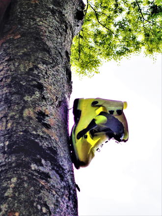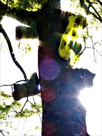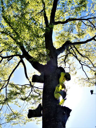 | あれやこれや取りつける高さ、向き、 間隔を試行錯誤し、 落下防止の為のザイルを結び、 欅の大木にビレーを取り、 いよいよアクロバットな作業開始。 アウターブーツとインナーブーツを 別々にして 4足の登山靴を幹に固定するまでに 2時間程かかった。 後は微調整すれば、何とかオブジェとして 愉しめるのでは! |