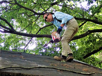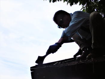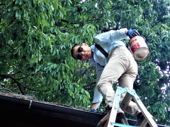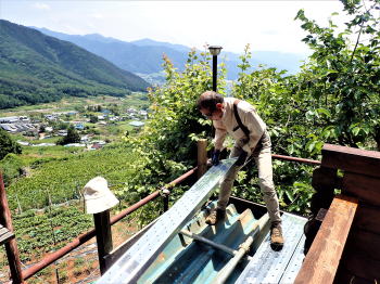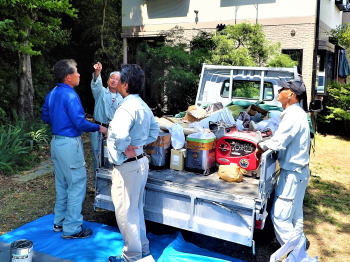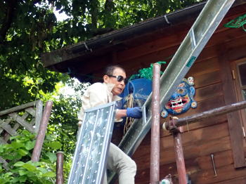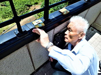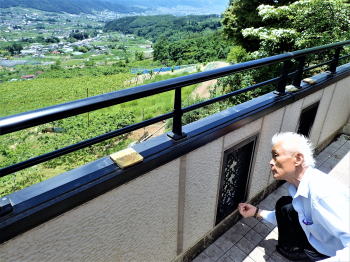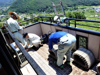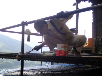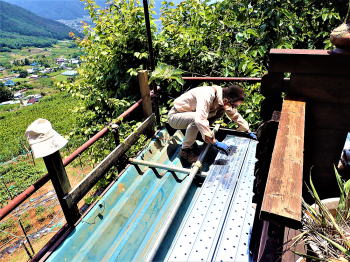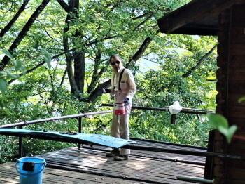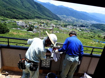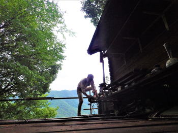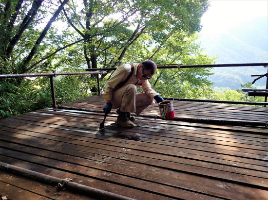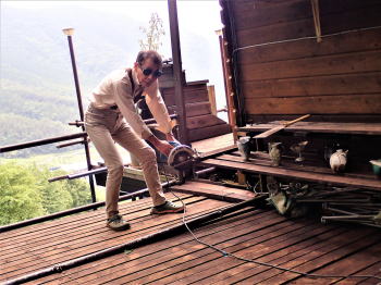 閃いた2つ目は 新たに造った倉庫内の照明。 4方向シートで覆ってあるので 彩光が無く、暗くて 物を探すのにとても不便。 先日電池式のライトを取り付けたが、 単三電池4本では明るさは知れたもの。 夜中に突然閃いたのは ログテラスの使わない照明を、倉庫内に 配線出来るのではと! 案ずるより産むが易しで、恰もこの倉庫に 設置する為に在ったかのように、 コードの長さもピッタリで、テラス床下から 倉庫への配線工事も終了。 さーあ、雨なので朝の洗濯は止めて、 即これから飯の仕度じゃ! テラス改修工事で語る テラス漏水がないか笠木を チェックしながらポツリと語る相川氏。 「2年前の冬、 燕岳で妻を亡くしました」 数年前の外装工事で山荘を訪れ 部屋に飾られたヒマラヤの写真を目にし、 「私も山が好きで 妻と一緒によくアルプスにも出かけます」 と話しかけられた。 それ以来何度か山の話に 2人で興じたことがあっただけに、 パートナーの遭難死の報は 痛みを伴って迫る。 |