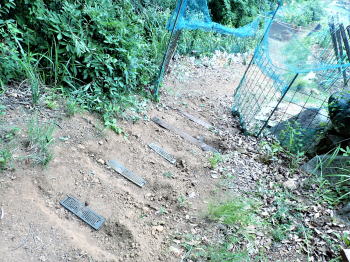 当初、先週造った林檎畑入口の 急斜面の階段の代わり、 この足場板を設置しようと思っていた。 が、耕運機を登下降させると 金属同士なので、 耕運機の回転刃も足場板も 致命的に傷ついてしまうと気づいた。 この2枚、当然ながら 合わせると6mとなり、ログ出窓下の 足場板として使えるのでは? |