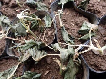 | となると当然、残すべき発芽苗も 掘り出されてしまうので、 埋め直しても枯れてしまう 懼れが充分にある。 つまり残された苗と 掘り起こした苗の双方を 失う危険を冒さねばならない。 |