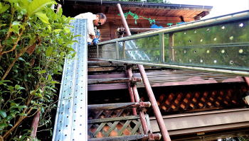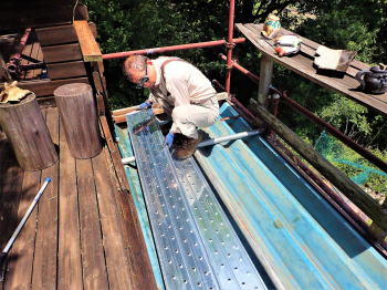 | 40kgもある4mスチール足場板が腰を直撃か! 6月27日(火)曇 計10枚のスチールをログに運び上げる 何度か凝りもせず、腐った合板を新しい合板に張り替えると云う、愚かしき行為を重ね、 今日に至っているのだ。 例によって突然閃いた。そうだ、屋外用のスチール足場板を使えばいいんだ。 腐った合板を総て引っ剥がし、この足場板に置き換えれば腐蝕の心配は解消し、頑丈なことこの上なし。 確かにそのアイディアは悪くなかった。 しかし4mものスチール足場板1枚が、40kg前後の重量があるとは知らなかった。 で、恐らくこの重い奴をトラックで運搬し、山荘庭を横切ってログの2階まで運び上げる作業が、 積算疲労となって突然襲いかかり、 25日午前11時11分、閃光、腰に鮮やかな一撃!となったのだろう。 |
