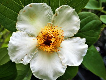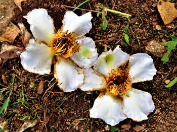 | 花回廊の横に 大きく幹を延ばし無数の 白い花を咲かせる夏椿。 夜明けに花開き、 夕刻には墜ちて茶褐色の 大地に還る。 蜩の哀しい音色が挽歌となって 夏椿の花弁に流れる。 |