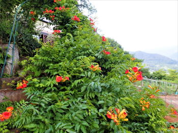 ![]() アーチへ延びる凌霄花(ノウゼンカズラ) |