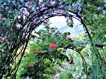 石段に掛かる3つのアーチ。 中庭に通ずる手前は、 真っ赤な蔓薔薇、 山荘中道に通ずる3つ目のアーチも 同じく挿し木で増やした蔓薔薇。 真ん中は凌霄花にしようと 数年前から前庭のを 中畑に挿し木にし、気長にアーチ咲きに なるのを待っていた。 今年やっとアーチまで延びて 姿を見せ、 花の回廊が完成した。 |