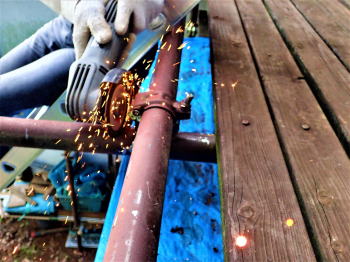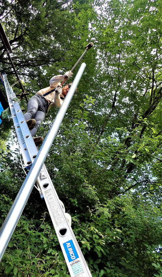 危険!梯子に乗って杭打ち 真新しいドリル3本を使って、不安定な足場ではあるが、 それでも全身の力を込めて 穿孔を試みたがドリルを跳ね返される。 今まで何度も直径46ミリの単管パイプに 穴を開けてきたが、 これ程までに難儀したことはない。� 10数分をかけてやっと1つ開けたが、 屋根を固定する板を取り付けるには、 この数十倍もの単管パイプと 板の穿孔が必要となり、とてもじゃないが やってられない。作戦変更。 |