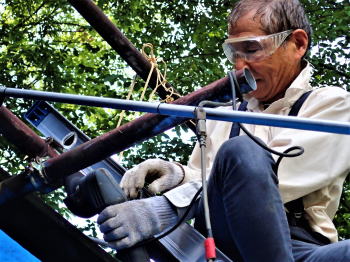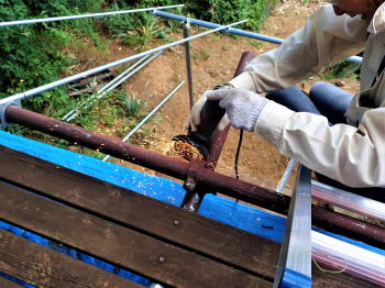 ![]() 梯子と鉄骨を結び落下防止 |