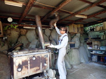 煙突が透明な赤に灼熱しているのだから、 その煙突から25cmしか離れていない簗が 燃え上がるのは当然としても、 今までに一度も 燃えなかったのはなぜか? 答えは明瞭な筈、 つまり今まで窯はこれ程までに 温度が上がったことは無いのだ。 しかし窯の温度計は 1200度を示し続けている。 そこで総てが読めた。 作品が大きすぎて、窯詰めの時に 長い窯温度測定器を 窯の外に半分程引き出して、 火入れしたのだ。 |