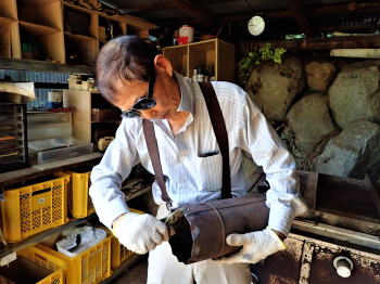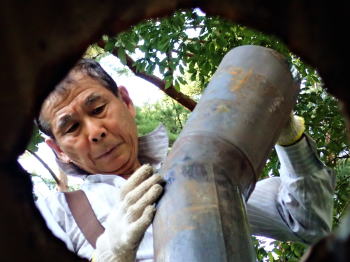 煙をくゆらし梁が焼き焦げ始め、 慌てふためいてスプレーで水を吹きかけた。 窯の温度を下げたいが 現在1200度、 あと30度は窯の温度を上げないと 作品が生焼けになる懼れあり、 窯の温度を下げる訳にはいかない。 が、このまま簗に水を掛けながら 温度をあげ続けるのは、極めて危険。 落ちた水滴が灼熱した煙突や窯に落下し 瞬時に爆発的に蒸発するのだ。 |