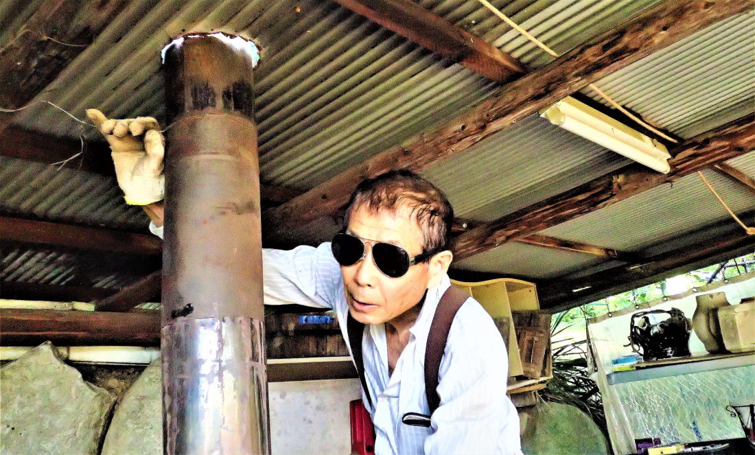| 屋根と煙突の隙間を埋めねば雨で窯が壊れる 屋根の葺き替えと耐熱パテ、コンクリート縁で対処出来るか? つまりセンサーの半分は外気温に晒されているのでセンサーが冷めて、正確な窯温度を伝えていない。 つまり現在の窯温度は、温度計が示している1200度を遥かに超えているのだ。 即、火を止めたのが7月1日、翌日窯出ししてみて、やはり推察は正しく作品は完全に焼き上がり1250度を超えていると判明。 7月26日には、危険なので窯を20cm移動したが、煙突が直角に曲がり簗の下を通っていることには変わりない。 そこで何とか窯と屋根の穴を真っ直ぐに繋げないかと、7月以来考え続けていた。 例によって閃くのを待っていたが、遅れに遅れ2ヶ月以上経った昨日、遂に閃いたのだ。 最大の問題は3点。1つは煙突の穴開き屋根下まで窯を移動できるか、2つ目は直に煙突を繋げるか? そして何よりも直に繋いだ場合、最大の心配は屋根を伝わり煙突と屋根の穴の隙間から流れ落ちる雨が、 窯室に入り込みはしないか?ということである。 少しでも雨が入り込むようであれば、窯の傷みは加速し、稼働してなくても壊れてしまう。 そこで考えに考え、昨日いよいよ作業開始。 |