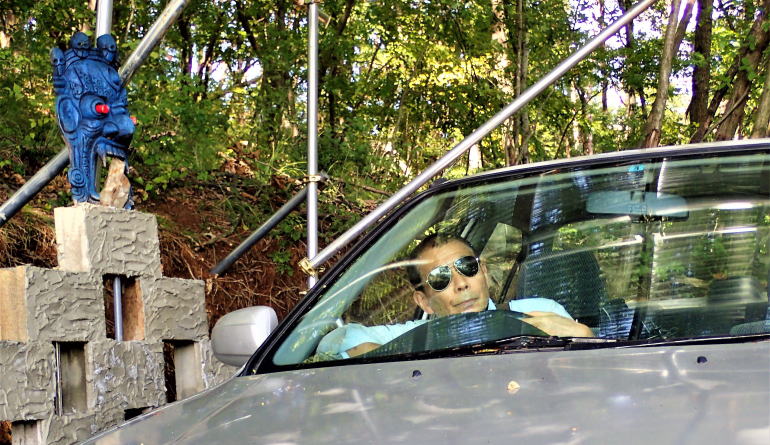 | ありゃ、チベット仮面が駐車場に出現! ランドベンチャーを迎える水晶を咥えた仮面 登録年月日を調べてみると平成9年3月13日、つまり20年前の1997年にフェリオは生まれ山荘の住人となったのだ。 |