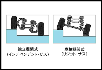 | 乗り心地を良くするために 乗用車の多くは 車輪が独立して車体に付けられている。 図の様にサスペンションが車体から 懸架されていないので 独立懸架式は構造的に弱い。 悪路には向かない。 |