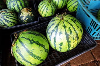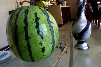 10kgを超えた今季最大の西瓜は、 近年大量発生している カメムシやウリハムシにもやられず 美しく健やかに育ち 2週間前に収穫。 少し寝かせておくと 追熟し甘みが増すので、 そろそろ食べ頃かなと調べたら、 蔓の部分が茶に変色し始め ブヨブヨになっているでは! こりゃ過熟し過ぎだと焦る。 実は今季最大のこの西瓜は 追熟したら、パークタワー東雲に 送ってやろうと そのチャンスをまっていたのだ。 |