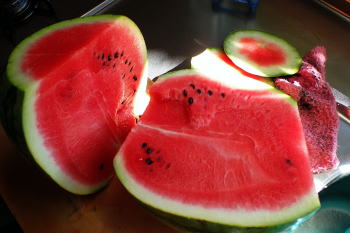 悠樹の分析も的を得ている。 例え割れてもクール便にし当日に届けば、 過熟した甘さを味わうことは 出来たのに1晩暑い倉庫に置かれたので 一気に腐敗。 試しに山荘に残っている西瓜を 切ってみたがどれも、 過熟した最高の甘さに満ちていて腐りは無し。 切ってしまった西瓜は 常温では腐るので総て冷蔵庫へ。 |