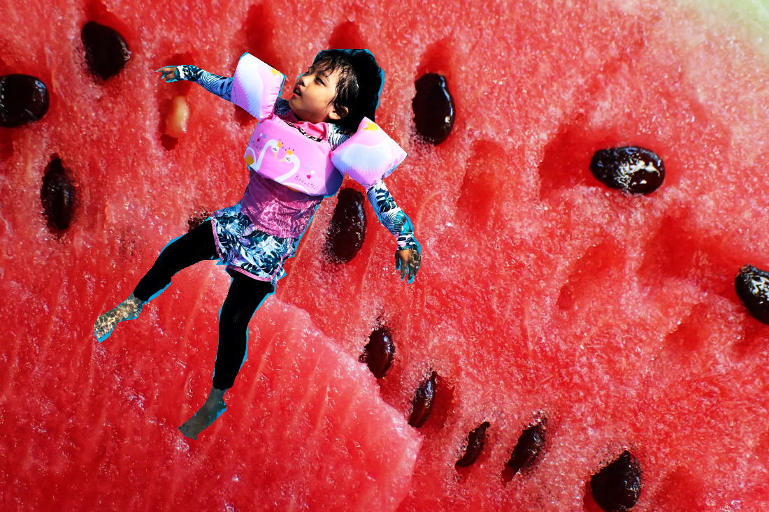 | いっぱい食べたら西瓜の海に浮かんじゃった! 8月19日11時35分 パークタワー山荘 粘々として花粉を絡めとり受粉する西瓜雌蕊の柱頭は、自家生殖を防ぎ同じ遺伝子型を形成しない企みを秘めている。 自己認識作用を持っていて、同じ遺伝子を持った花粉が柱頭に着くと、受粉を拒否するのだ。 花粉の発芽、花粉管の伸長、胚珠の受精、受精胚の生育、のいずれかの段階を停止し、受粉を中絶してしまう。 それだけではない西瓜の場合は雄蕊の花粉にも爆薬が仕込まれていて、花粉が雨に当たると花粉そのものが爆発してしまう。 従って受粉後であっても4時間以内に雨に当たると、花粉は破裂し自家受粉は阻止されるか、良質な実は着果しない。 そうまでして未来に自らと異質な遺伝子を残そうと企む西瓜! 仙人は他の苗から育った花粉を、別の雌蕊柱頭に受粉させながら、生命の企み、遺伝子の陰謀に想いを馳せる。 桃菜はたらふく西瓜を食べ身体中を真っ赤な西瓜で満たし、西瓜の海にプカリぷかり! だんだん桃菜は小さくなり、漆黒の遺伝子となり異質な遺伝子を形成し、未来へ旅立って行くんだね! (参照wikipedia) |