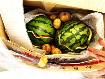 | この程度の変色ブヨブヨ加減では 問題なく、寧ろ最高の甘さに なっているのだが、素人の見た目には 悪印象に映るのだ。 そこでこの最大西瓜を 送るのはやめて、 バレーボールよりやや小さく 未だ過熟してない 中玉西瓜2個を送ることにした。 ヤマト運輸だと9時20分までに 発送すれば、 当日18時以降に届くので、 急いで梱包し線路と反対側の 遠い下於曾までバイクを飛ばし発送。 |