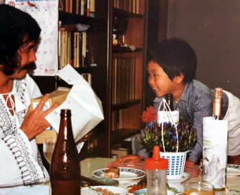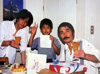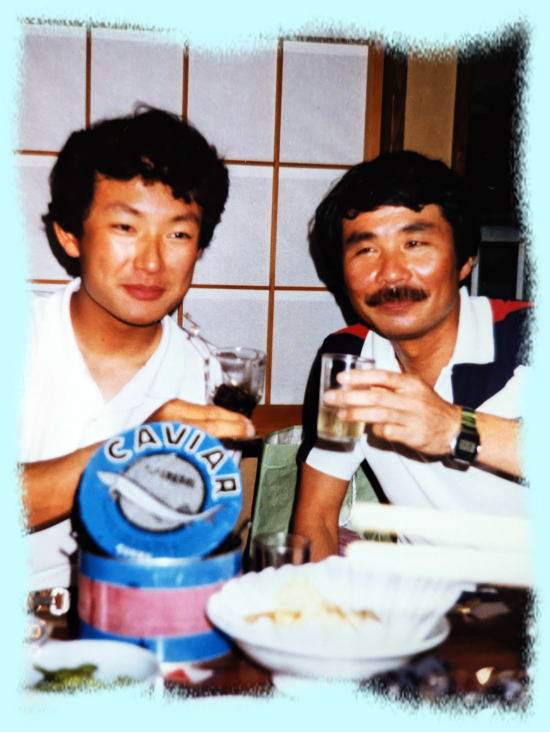 ![]() 最年少登頂した陽介君(23歳)とキャビアで乾杯! 1988年9月12日レーニン峰(7134m)登頂後の祝賀会にて |