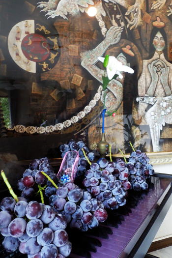 アップルで実験1,2を追い続けるのは、 夢の続きを追い続けることとなる。 だが、このオーマイゴッド粒子、 アマテラス粒子を捉えるのは 至難の業で、現在は夢のまた夢。 《アメリカ・ユタ州の砂漠地帯に 滋賀県の琵琶湖とほぼ同じ広さの 700平方キロメートルの範囲に 507台の検出装置を設置し、 15年前(2008年)から 地上に降り注ぐ宇宙線の観測を続け 今回アマテラス粒子を捉えた・・・・》 507台の検出装置と15年を掛け、 アマテラス粒子は やっと捉えられたのである。 如何に困難であろうと 挑もうと想い続ける限り、 夢は生きる力を掻き立ててくれる。 そうやって陽介君とも仙人は ヒマラヤで、ザイルを 組んできたのかと ニコニコしながら噂している 山荘壁画の祈る女達、 豊穣の稔りに光る果実たち。 |