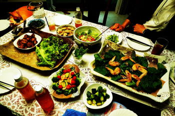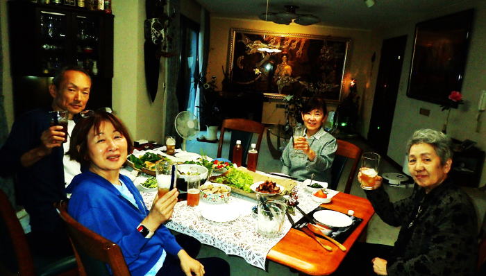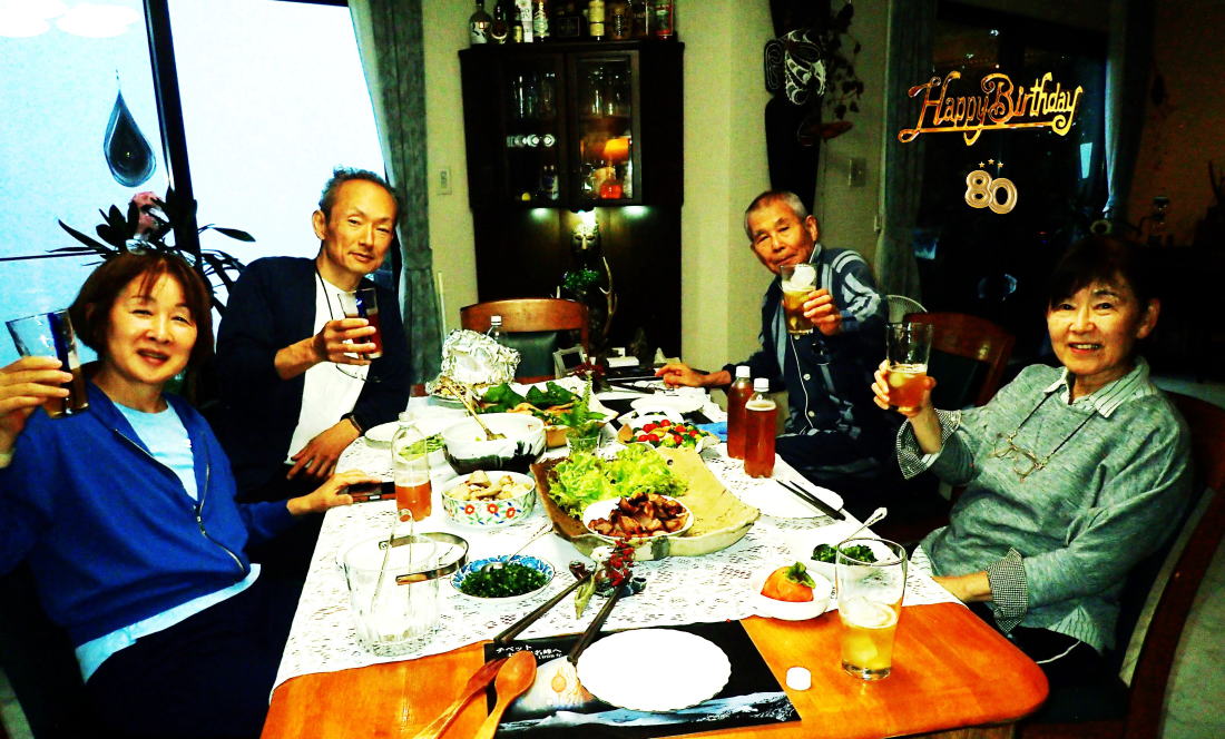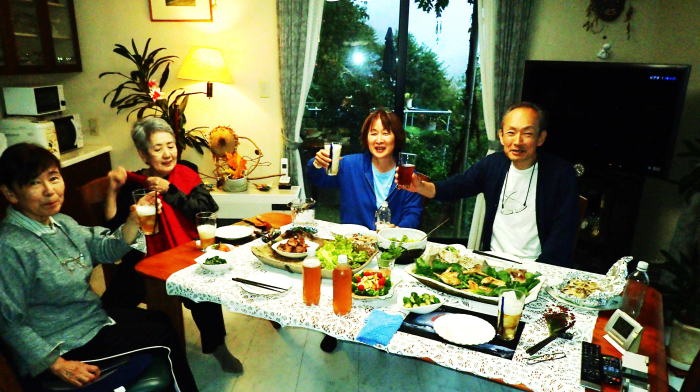 一生に一度の経験 冨美代さんと村上さんが自宅から持ち込んでくれた数々の手料理が並ぶ。 冨美代さんの豚肉の特製タレ仕込みのグリルが最高に美味しい。 村上さんのお袋の味的な大根&椎茸と豚肉の煮物、エビのサラダ、チキン手羽焼き、 サーモンとキノコの蒸し焼き、それに里いもと鶏肉の煮物。どれも疲れた身体に染み渡る美味しさであった。 作ってもらうありがたさに感謝。 山荘のプチトマト、リーフレタスや春菊や大根の葉などの葉っぱ類がこれまた彩を添えて豪華なご馳走であった。 ご馳走と自家製ビールで話は盛り上がる。男性陣は日課と時差ボケで早々にリタイヤ。女子会は9時ごろまで続いた。 次の日は6時起床とのこと、タイマーをセット。しかし6時というのは6時には活動開始の時間であったのをすっかり忘れていた。 早々に陽介さんと協力して素早く準備。アメリカで優雅な生活を送っていると日々のディシプリン(discipline)は皆無である。 たまにはこういう規律のある生活をするのは刺激的だ。お天気は雨模様。 それでもせっかく塩山まで来たのだから体を動かしたい。 焼き立て人参パンと昨日の残りでかなり豪華な朝食をとりながら、テレビで紹介するお天気と睨めっこ。 日本のテレビではありがたいことに服装の提案もある。 しかし、まさか雨の中で100kgくらいありそうな大きな岩を運ばされるとは誰が予想したことか。 うんともすんともいわない岩を一輪車に乗せて運びたいらしい。 一輪車が壊れそうだったがなんとかシニア4人で玄関まで運べたときは不思議な達成感を味わった。 普通の人はやらないだろうし、一生に一度の経験だろう。 |