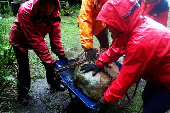 | そりゃ100kgを優に超える 唯でかくて重いだけの 大岩を仙人一人で運んだり オブジェに仕上げたり なんてとても出来るわけない。 だが陽介君が10月に来るとなると 充分に移動できる。 こんな素晴らしい贈物はないと いうことになるのさ。 |