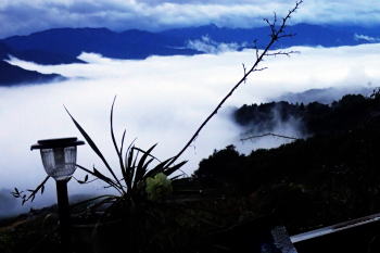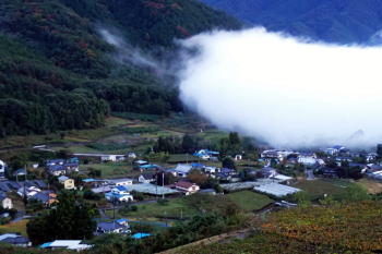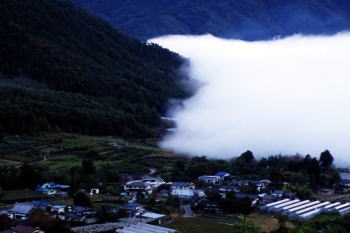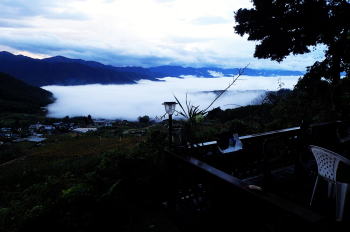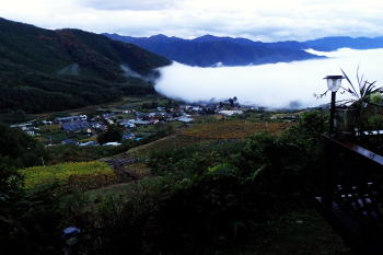 4人をランドベンチャーに押し込み 塩山駅に送り、 山荘に戻ると龍の舌の如き雲海が、 静止しているかの、 眼に観えぬ動きで時間と空間の 造形物をジワリ、 じわり呑み込んでいく。 観ていても動かないのに、 一瞬眼を離した刹那に 確かに次々と 呑み込まれているのだ。 |