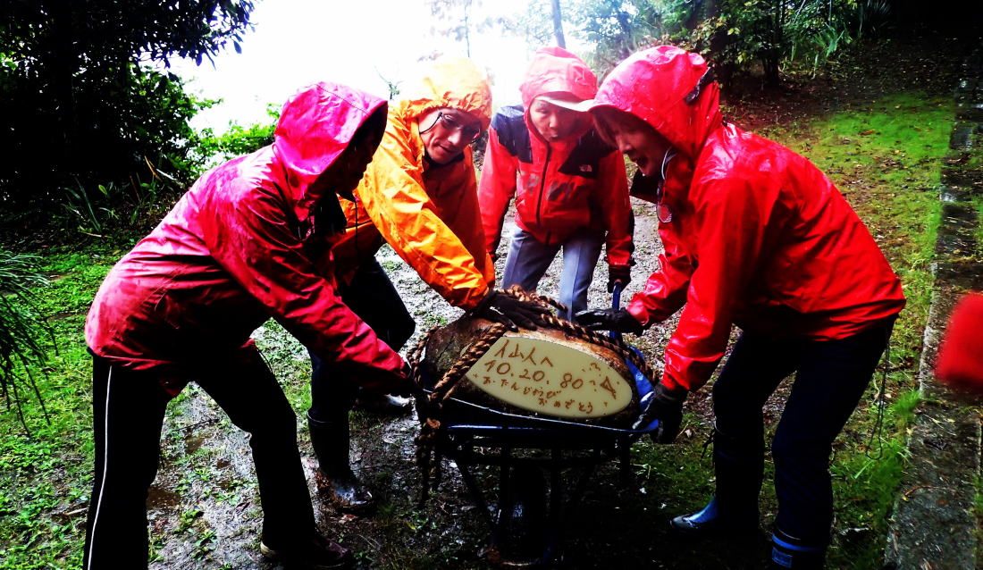 必死で運ぶが汗が噴き出す 翌朝のパンの焼き上がりが6時20分とのこと、 あまり夜更かししている訳にもいかず、それでも気がついたら9時を過ぎ、 まだまだ話は尽きないものの我々も寝ることにした雨がかなり激しく降る夜であった。 10月9日 朝は予定通り6時には起床して、キッチンへと向かう。 皆で手分けして、朝の食卓が整う。焼き立てのパン、なみなみと注がれた牛乳、 昨夜の残り物も彩りよく並べ替えられ、レタスにくるんで焼き立て肉を食べると実に美味しい。 山荘の土に育まれた野菜たちの美味しさが際立つ、何と贅沢な朝食だろう。 雨は相変わらず降り続け、外は真っ白な霧に包まれ視界を覆う。 だんだんに霧が晴れると、少しづつ広がる景色はむしろ幻想的で雄大に感じられる。 昼過ぎまでは雨との予報なので、本日はのんびり過ごすことになるのかと思いきや、 朝食が済むと早速仙人より指令が出る。 陽介さん夫妻が雨の中、長靴にゴアの雨具という完全武装で作業に従事するらしい。 石を運ぶとのこと。私たちは朝食の後片付けに精を出し、結構強い雨脚を見ながら、外仕事は免れたとホッとしていた。 でも、平穏な時間は長続きしない。 突然キッチンの扉が開き「村上さん!ちょっとだけ手伝って!」お呼びが掛かった。 長靴は見当たらないので、ゴアの雨具だけ羽織り、雨の中へ出陣。 駐車場の奥の道に、猫車に積まれた大きな岩が待っていた。 苦戦の跡が見て取れ、猫車の台車も変形している始末。私が一人加わったところで、そんな簡単に動くはずもない。 陽介さんが車輪の前を掘って、道筋を作っているがどうなるやら。 ロープも登場して、一輪車から石が転がり落ちないように、細心の注意でバランスを取り、恐る恐る移動させる。 必死で運ぶが汗が噴き出す。 |