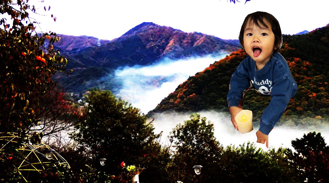 | 雲海のシャーベットが僕の朝ごはんだよ! 11月19日(火)ー1℃ ドーム目の前の小倉山からニョッキリ生えた櫻君 雲海を左手で掴んではコップに詰め込んで、あれっ幾ら入れてもいっぱいにならないなと仙人に訴える。 |