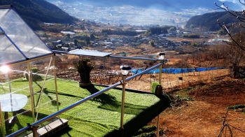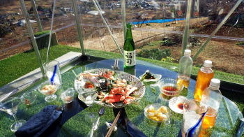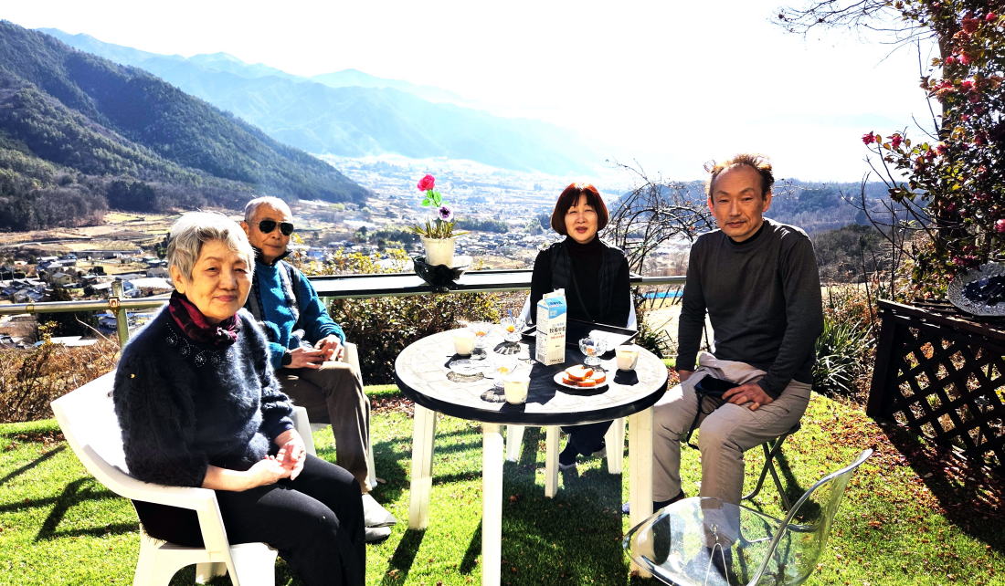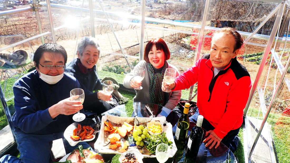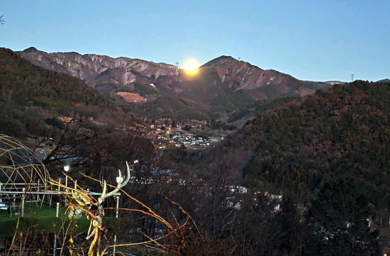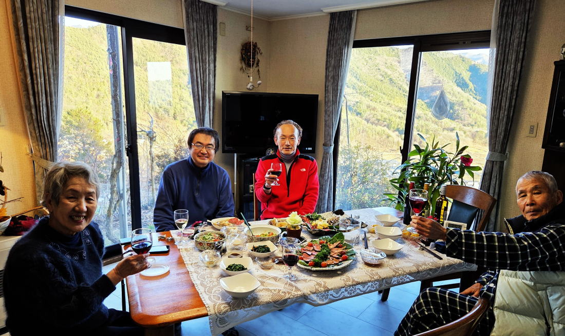 山荘に戻ったらテーブルがいっぱいのご馳走 明るい場所に出たら、幸い見たことのある景色が見えてきた。山荘の畑の下に続く道である。3時間越えの強行訓練であった。 後から思えば、柵に沿って突き進めば次のゲートに辿り着くかもしれなかった。そうしたらもっと早く帰れた可能性もあった。 これもまたいい勉強である。山荘に戻ったらテーブルがいっぱいのご馳走が並んでいた。 もちろん自家製ビールや持ち込んだワインの数々も添えられていた。冨美代さんのお手製の野菜料理、肉料理。 お正月らしく栗きんとんや伊達巻きたまご、かまぼこなどなど色とりどりだ。 また、隊長作の大根と鶏肉の煮付けなどが並びどれも疲れた身体に染み入る美味しさだ。 私は自家製きのこ類のマリネもどきとサラミやロースハム類を持参。 キッチン用具が揃わず簡単なものしか作れないので次回はもう少しマシなものを持っていこう。それと、自慢のオリーブオイルも! 夕日に当たる富士山の美しさを眺めながらの宴会は続き、あっという間に太陽が沈み、反対の小倉山方面から満月が登場。 真っ暗になるまで外に出て写真を撮ったり、眺めたり、話し込んで、食べたり、呑んだり、を行ったり来たり繰り返した。 私が山荘に来る動機の一つは冨美代さんに会うこと。こんなに素敵な人を独り占めしてのおしゃべりに大満足。 彼女の人生観や関わる活動など、本当に面白い。 最近、若い女性たちと話す機会が何度かあり、あまりいいアドバイスは出来ていないな、 という自分がいて、私も誰かのいい先輩になれるようまだまだ人生に磨きをかけねばならぬ。 そろそろ宴会も終わり、次の日のスケジュールをいい渡される。6時起床、朝食、畑仕事、裏にある扇山散策。 朝食をたっぷりいただき、男性陣は早々と畑仕事へ行き、女性陣は片付けや掃除を済ませて合流。 雪も降るような気候にもかかわらず、ほうれん草をはじめ春菊、ちんげん菜、キャベツやクレソンのような菜葉がまだまだ植っている。 食べられそうな部分を残してトマトなど枯れた作物の処理と土壌の整備を行った。 |