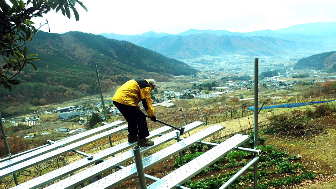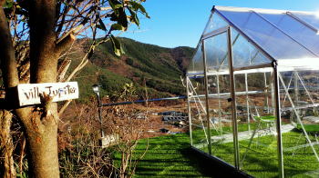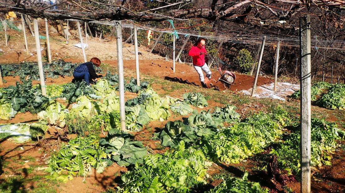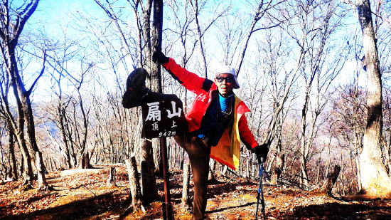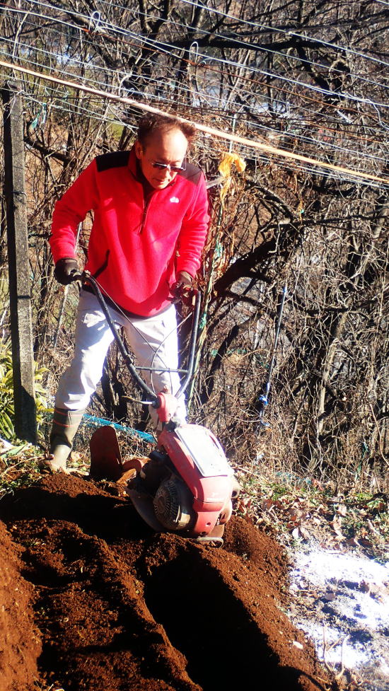 土に石灰と鶏糞を蒔いてからトラクターで土地を平す 山荘での冬での作業は初めてかもしれない。 枯れた根っこを抜いて、頭上の蔓を取り省き、土に石灰と鶏糞を蒔いてからトラクターで土地を平すまでが大まかな作業だ。 アメリカでも野菜作りはしているが、たかが小さなタタミ一畳ほとどの箱が3つ。 その一つはローズマリーやオレガノなどのハーブボックス。これは簡単である。土壌には石灰が欠かせないと隊長はいう。なるほど。 しかしかなりの広さがある畑である。全部やるのか?今?作家気質の大塚さんが先生に指示をあおぐ。 聞きたいことを聞いてくれるのでありがたい。陽介さんは黙々と作業をする。 私が「出来るところまででいいらしいよ」といっても、黙々と全てやってしまった。 まるで悪魔の囁きのような私のいうことには聞く耳を持たず陽介さんは黙々と作業。 畑仕事のご褒美はサツマイモである。収穫したサツマイモが貯蔵庫の麦藁をいっぱいにした箱に入っていて、好き放題貰えた。 しかしもう来週末には渡米の身。両手で持てるだけにしておいた。さて、お次は扇山への散策である。 昨日の山の半分程の距離だという。今回はフル装備の大塚さん。ジョキングシューズやストック両手、それに手袋までしている。 午後からのハイキングなのでぽかぽか暖かい、いい出足である。 頭の中には「冨美代さんが遭難しそうになって山の反対側の町まで降りてしまった」という恐怖の話がぐるぐるしている。 山を軽くみてはいけない。歳を重ねて気付くことは実は登りの方が楽だ、ということ。 かなりの急斜面を木から木へと這い上がりなんとか登り切る。 するとすぐ右手が山頂だった。ここは扇山、942mである。記念撮影を何枚か撮って気持ちを整えて、さあ降りだ。 |