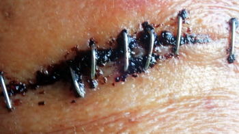 | 仙人が墜落したのは延長したこの芝生工事中なのか! 2月1日(日)晴 ぷちクレール延長芝生 出血が止まらないので救急医療を受けねばならぬが、救急車119よりも自分の車で駆けつけた方が早いし帰りも都合がいい。 しかし自分の車で行くと救急扱いを受けられず待たされるかもと塩山病院に相談。 今直ぐの診察は無理なのでと浅利脳外科クリニックを紹介してもらう。 クリニックに連絡すると脳外科だけでは対応出来ないので他を当ってくれとのこと。出血は止まらず、これ以上グズグズしてるとヤバイ! 即車に乗って塩山病院に駆けつける。 脳外科の渡邊徳晶Dr見事なまでにやる気の無い対応で、それじゃホチキスで縫いますと麻酔もなしで、 いきなりパチンぱちんと左額に7発針を打込む。 痛えの何の思わずイテーと叫ぶ。1週間後に抜くから来て下さい。 序にx線とCTスキャンをとって骨に異状なしを確認し念の為と、 左脛、右膝、左腕左太腿の打撲を観て貰うため整形外科の岩窪武Drに回される。 待っている間に左膝辺りのズボンの内側から血が流れ出し、待合室の廊下を赤く染める。 看護師が血に気付き車椅子でベッドのある病室へ仙人を搬送。 それから待たされること更に2時間、血の流れがタイツの圧迫でやっと少なくなったころ診察。 うん、こりゃ複雑な裂傷なので抜糸は再来週になるなと整形外科の岩窪武Dr。 この小さな人工芝の庭でぷちクレールの工事は完了! 81歳の老劣化の極みにあるポンコツ仙人が、僅かこれっぽっちの代償でぷちクレールの工事が完成したなんて奇跡じゃや! 独りほくそ笑む仙人であった! |