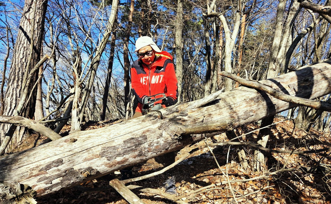 | 登山道を塞ぐ大木伐採 数十本の倒木を伐り最後の一本を陽介君と2か所で切断! |