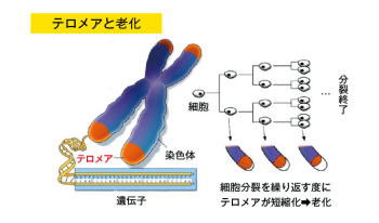 ![]() 酵素テロメラーゼは テロメアDNAを修復させる酵素であり、 無限分裂能をもつ細胞 |