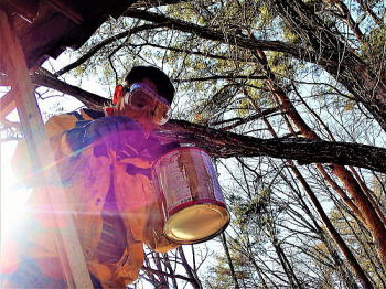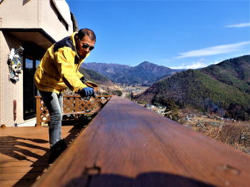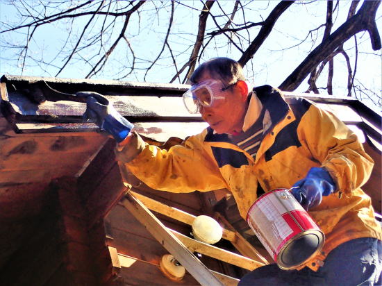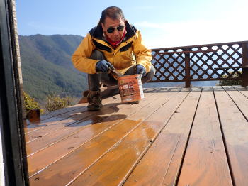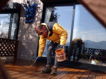 ![]() オイルステンをコーナーから塗る 24年目を迎えた山荘活動でその鮮やかな刻印を上げるなら、 先ずログハウス建設を上げねばなるまい。 2002年12月から翌3月までの 4か月間で数人の卒業生や山仲間と共に作り上げたログハウス。 素材の北欧の唐檜(スプルース)は、 堅く緻密な樫や欅に比べると朽ち易いので 年2回オイルステンを塗って、腐朽を防がねばならない。 |