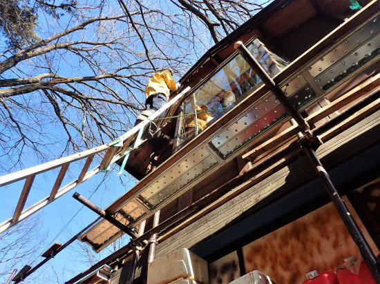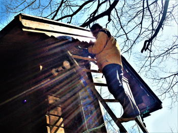 雨をもろに受ける北側の切妻は、 長い梯子で無いと 届かない上に 梯子を置く大地が斜面で 極めて不安定。 その為16年間もメンテナンスされず きっと既に腐朽が進み、 板材の交換が 必要になっているに違いない。 |