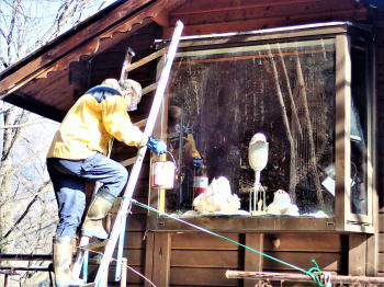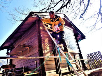長い2連梯子を買ったので やろうと決意さえすれば、 出来なくはないと先週から ログハウスのオイルステン塗り開始。 不安定な長い梯子が 左右に倒れないようにロープで固定し、 塗料缶と刷毛を持って 確保ロープ無しで 恐る恐る塗り始める。 |