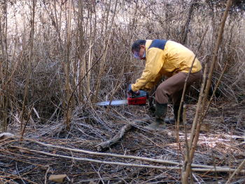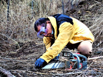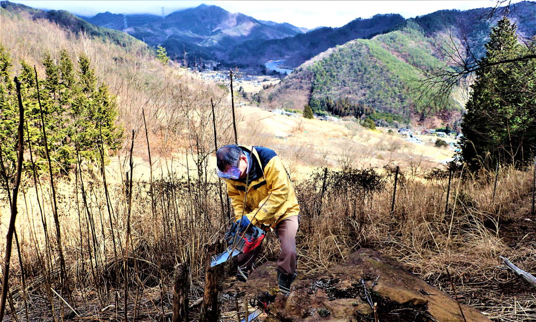 | 芽吹く前に水源森の伐採もせねば! 3月6日画像 研いだばかりのチェーンソーの大活躍! 山荘水源森は扇山の東ルート中腹にある。 扇山とP2峰の間に在る扇峠から湧き出し、水源森を経て竹森川に注ぐ小さな谷は降雨後、暫くは流れるが 晴天が続くと地下水となって涸れ谷になる。 涸れ谷となっても地下水が流れ続けるし陽当りも抜群なので森の生育は頗るいい。 放っておくとあたり構わず木々が跋扈し、扇山への踏み後が消えてしまう。 ここ数年間、冬には伐採を続けてきたが此処までチェーンソウを担ぎ上げての伐採はしんどい。 今年が最後かな! |
