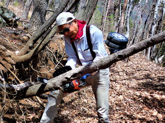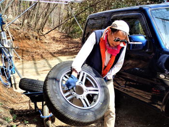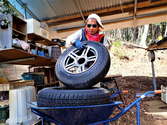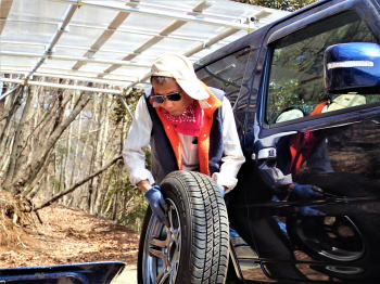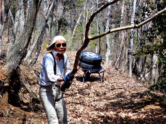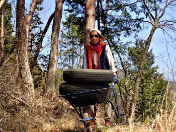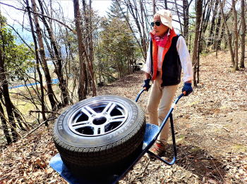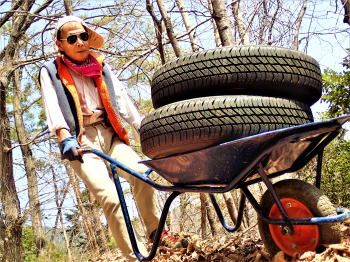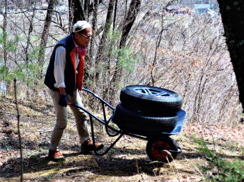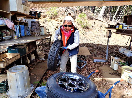 | 冬タイアよさらば! スタッドレス交換 4月1日(日)晴 交換タイアを2輪揃えて転がして運ぶのだが、転がせそうもない。 ランドヴェンチャーのノーマルタイヤ保管場所をいつもの轆轤室横では無く、作陶場にしたので車庫まで転がすとなると 森の中を通らねばならず、森の道にはアップダウンが3か所もある。 1個19kgもあるタイアを2個同時に転がせば、下り坂では勝手に暴走するし、登り坂では上げられず完全にギブアップ。 そこで一輪車を使うことにしたが、となると今度は倒木が森の道を塞ぎ、 タイアを運ぶには倒木の伐採から始めねばならず、畑、庭仕事が山積し猫の手も借りたいのに、なんつーこっちゃ!。 |