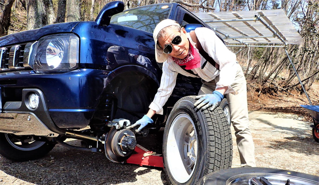 焦ると事故る危険性が高まるので、 良く云い聞かせながら 恐ろしいチェーンソウで タイアロードを切り拓く。 タイアを固定するボルトは5本あり、 タイアそのものも大きいので フェリオより面倒かなと ジャッキーで上げてみると簡単。 |