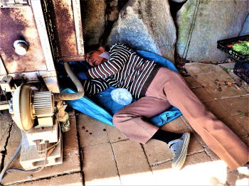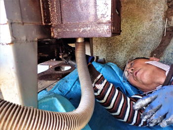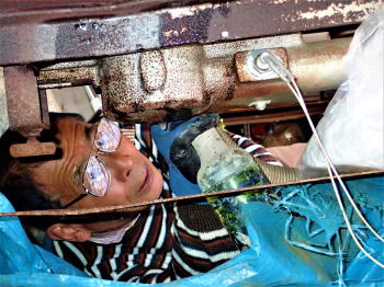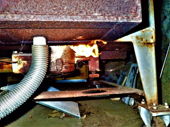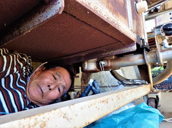 狭い窯下で修理作業 3月4日(日)晴 欠落記録 コンクリ床と窯底との隙間は最大33cm、 修復せねばならぬ バーナー下の円型火口受には鉄の横板が 渡してあり床から15cmしかない。 肝心の補修箇所は床から僅か23cmしかない。 |