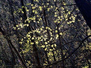 さざめく森 咽返る命の飛沫に臓腑を抉られ、 暫く車窓に釘付けになってしまった。 決して動くことの無かった 山並みがウルウルと盛り上がり 波打ち流れ、 実にダイナミックに春の大気を 駆け巡るのだ。 |