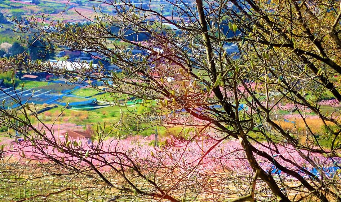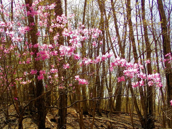 | 芽吹く山荘と眼下の桃源郷 4月13日(金)晴 2階テラスから 感性の扉にそっと指を滑り込ませ、指の内側で感性をなぞってみる。 生命の樹液が迸り差し入れた指を解かす。 指が第3の眼を得たように視覚を意識し、生命の樹液にベトベト熔解されつつ上条の森へ突き進む。 第3の眼が目にした上条山稜線の三つ葉躑躅群落が、如何に幻想的な美しさに満ちていたか、 とても仙人の筆力では表し得ない。 |