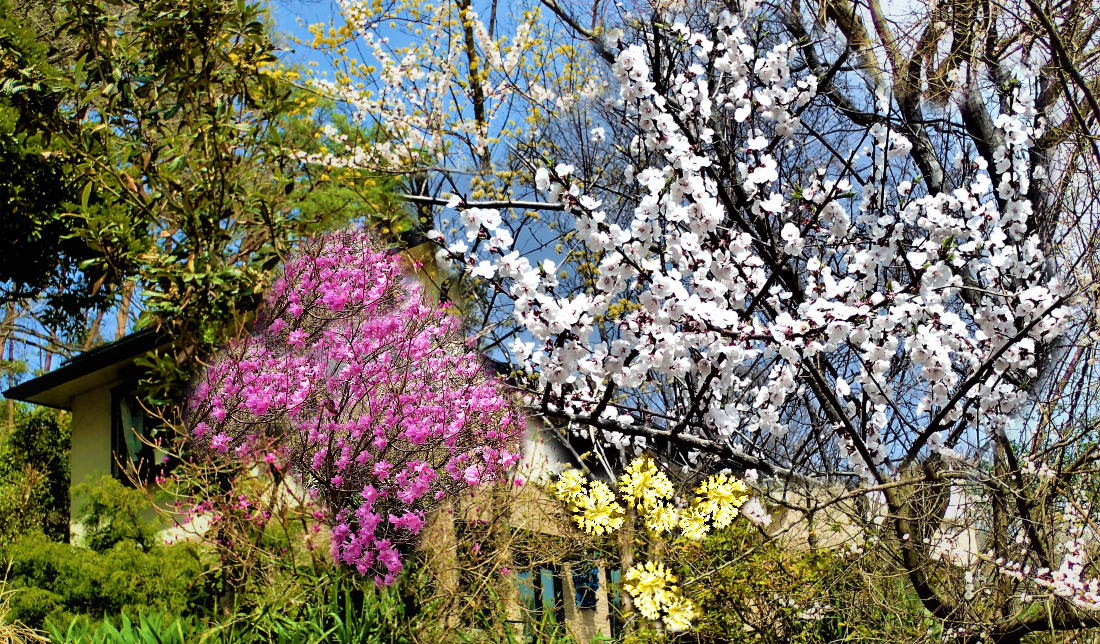 | 杏、山茱萸、三つ葉躑躅が山荘を彩る 4月13日(金)晴 西畑から ところがどうだ、僅か1週間ですっかり眠気を吹き飛ばし、春の大気を食い尽くさんばかりに貪り、 山並み同士が競い合って命そのものに覚醒しているでは! 命に満ち満ちている中央線の車窓から放たれた精気に煽られ、仙人はすっかりご機嫌!よーし山だけでなく、春の海にも乗り出さねば! これから畑仕事や庭仕事が益々忙しくなると云うのに、何考えているのか! そう云えばこんな能天気なセリフを吐くときの仙人の心象は、救い難き混沌とした底知れぬ闇に覆われ、 何処にも出口は見えず、ただ狼狽えていることが多いのだ。 つまり咽返る命の飛沫に臓腑を抉られたのは、抉られることが仙人にはどうしても必要だったと云うことなのだろう。 |