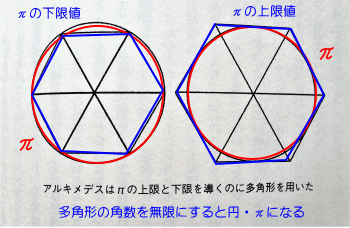 外接する多角形から上限値を求めた ≪どんな有理係数の代数方程式の解にも ならないような複素数≫が超越数であるが、 生活感に著しく乏しく、 そもそも超越数なんぞと云う 言葉すら余り知られていない。 |