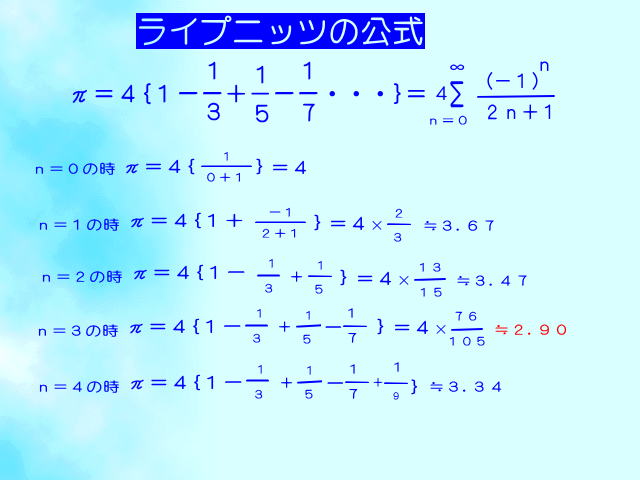 各項が奇数の逆数である交項級数がπに収束する、つまり限りなくπ=3.14159 26535 89793・・・に近づいていくのだが、 n=3は数値がπより小さくなる。 その誤差を計算すると3.14-2.90=0.24 n=2の時は3.14-3.47=0.33となる。 これから明らかに n=2よりn=3の方がπに近づき収束していることが解る。 |