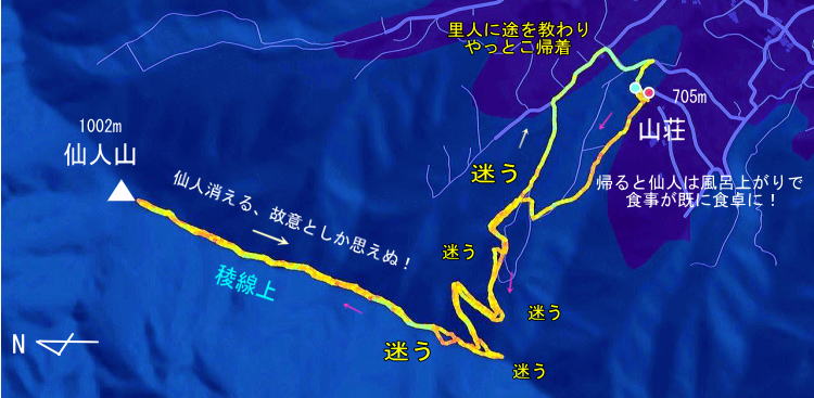 そうだった! 仙人顧問の《探検部や山岳部》 の 生徒を引き連れては 山荘にやって来て、山頂まで散歩。 小倉山頂から山荘を眺めて 「ほら、観えるだろ! あそこが今歩いてきた山荘だ!」 各部員に渡した10万分の1地図で 仙人は現在位置と 山荘位置、下山ルートを示し サバイバルゲームの開始。 10分間隔で1人ずつ山頂から 独力のルートファインディングで下山。 但し途中で前に出発した部員に 追いついたら2人で 協力しての下山はOK! |