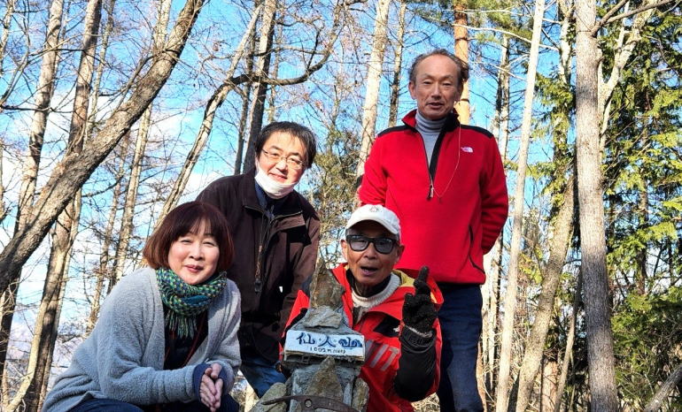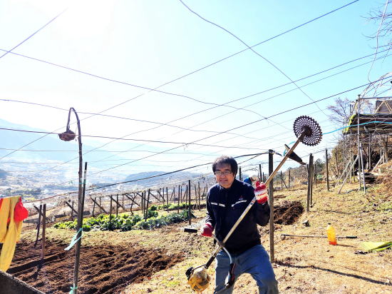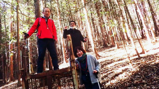 土に石灰と鶏糞を蒔いてからトラクターで土地を平す 山荘での冬での作業は初めてかもしれない。 枯れた根っこを抜いて、頭上の蔓を取り省き、土に石灰と鶏糞を蒔いてからトラクターで土地を平すまでが大まかな作業だ。 アメリカでも野菜作りはしているが、たかが小さなタタミ一畳ほとどの箱が3つ。 その一つはローズマリーやオレガノなどのハーブボックス。これは簡単である。土壌には石灰が欠かせないと隊長はいう。なるほど。 しかしかなりの広さがある畑である。全部やるのか?今?作家気質の大塚さんが先生に指示をあおぐ。 聞きたいことを聞いてくれるのでありがたい。陽介さんは黙々と作業をする。 私が「出来るところまででいいらしいよ」といっても、黙々と全てやってしまった。 まるで悪魔の囁きのような私のいうことには聞く耳を持たず陽介さんは黙々と作業。 畑仕事のご褒美はサツマイモである。収穫したサツマイモが貯蔵庫の麦藁をいっぱいにした箱に入っていて、好き放題貰えた。 しかしもう来週末には渡米の身。両手で持てるだけにしておいた。さて、お次は扇山への散策である。 昨日の山の半分程の距離だという。今回はフル装備の大塚さん。ジョキングシューズやストック両手、それに手袋までしている。 午後からのハイキングなのでぽかぽか暖かい、いい出足である。 頭の中には「冨美代さんが遭難しそうになって山の反対側の町まで降りてしまった」という恐怖の話がぐるぐるしている。 山を軽くみてはいけない。歳を重ねて気付くことは実は登りの方が楽だ、ということ。 かなりの急斜面を木から木へと這い上がりなんとか登り切る。 するとすぐ右手が山頂だった。ここは扇山、942mである。記念撮影を何枚か撮って気持ちを整えて、さあ降りだ。 |