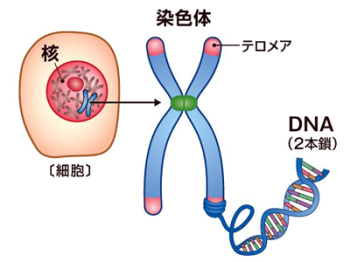 染色体(遺伝子と蛋白質)の先にテロメア |