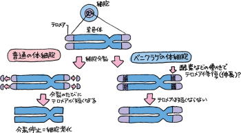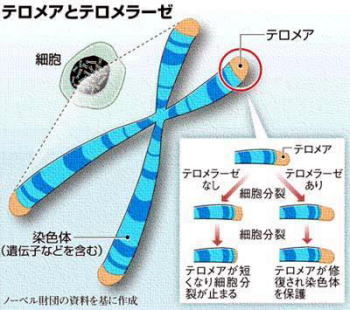 ![]() 酵素テロメラーゼは テロメアDNAを修復させる酵素であり、 無限分裂能をもつ細胞 |
