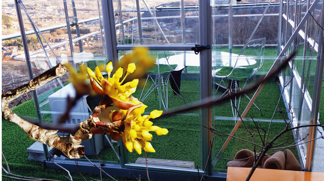 | ありゃ!確か昨春には無かったのだが! 3月1日(火)晴 前庭石卓の山茱萸が新たなぷちクレールを黄金の光で祝福! |